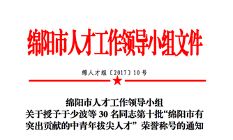 于少波董事長(zhǎng)榮獲第十批“綿陽(yáng)市有突出貢獻(xiàn)的中青年拔尖人才”榮譽(yù)稱號(hào)