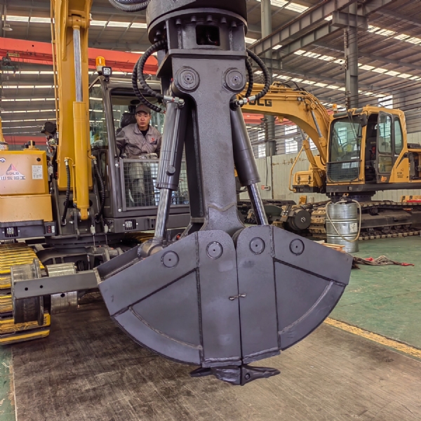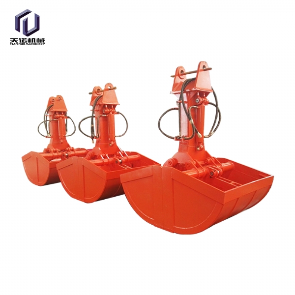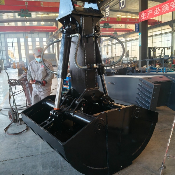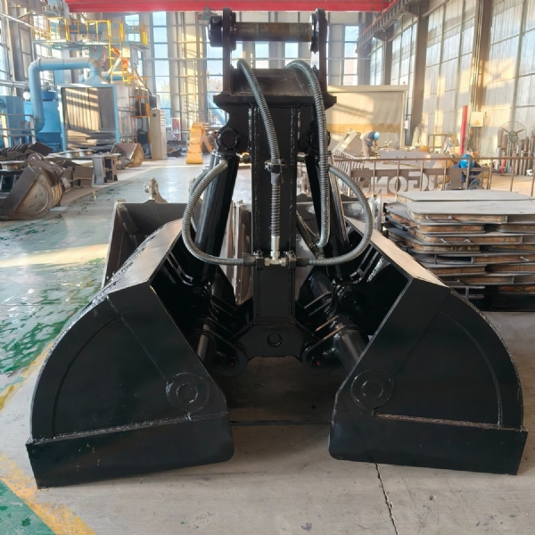挖掘機貝型斗(也叫抓斗,哈殼斗)分為液壓回轉和不帶液壓回轉兩種。不帶液壓回轉的貝型斗采用挖掘機鏟斗油缸的油路,不用另外添加液壓閥塊及管路;帶液壓回轉的貝型斗要添加一套液壓閥塊及管路來控制,油缸配置活塞保護裝置。